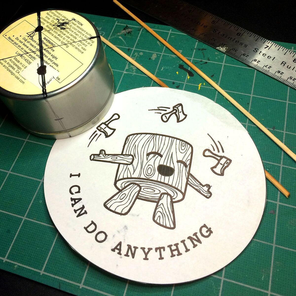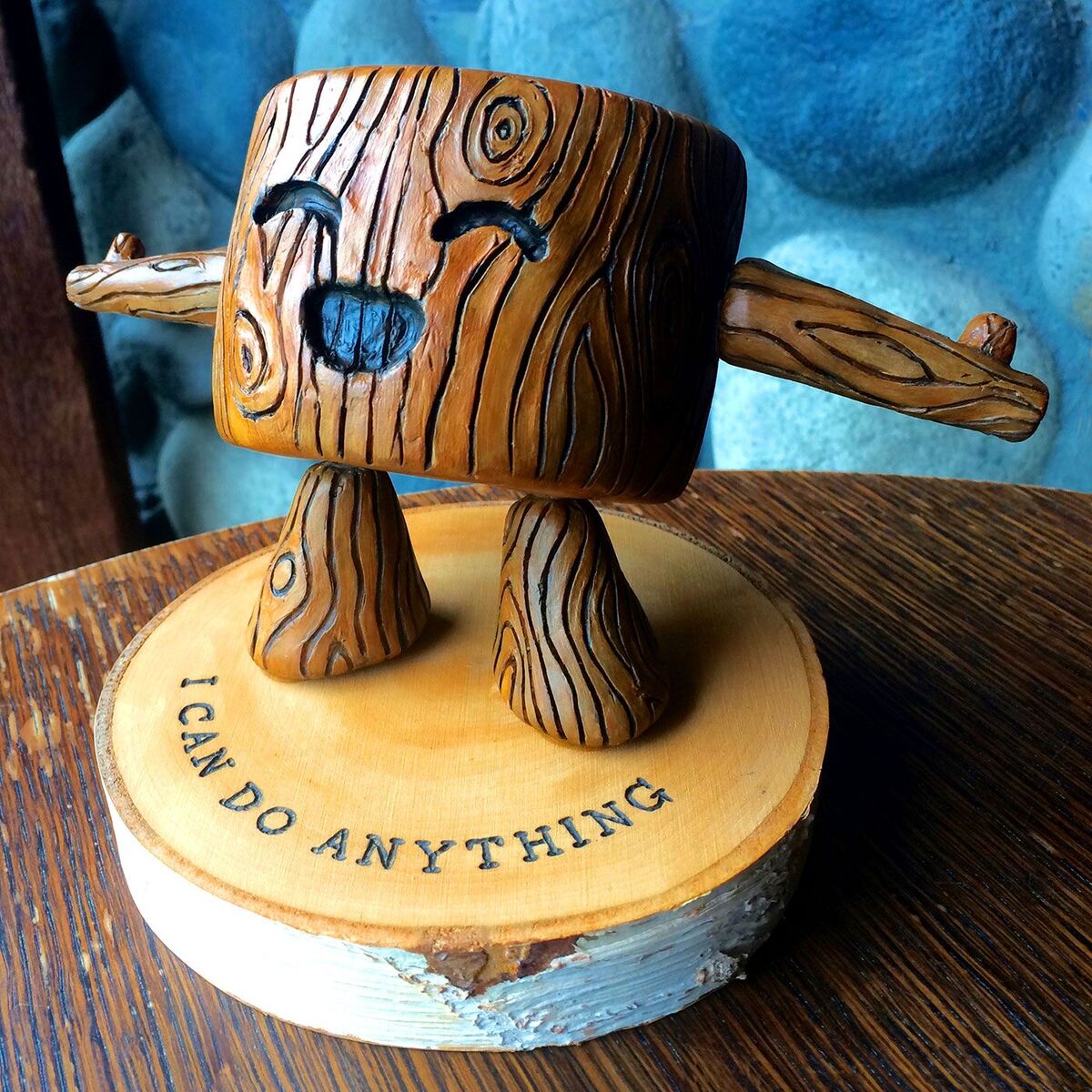 Okay, now to put Humpty Stumpy back together again. I sanded down the connection pieces and put everything together with some good old superglue. Of course it is not complete without a wood platform and some wood burning messaging to finish it off. Finished! Long live Stumpy!