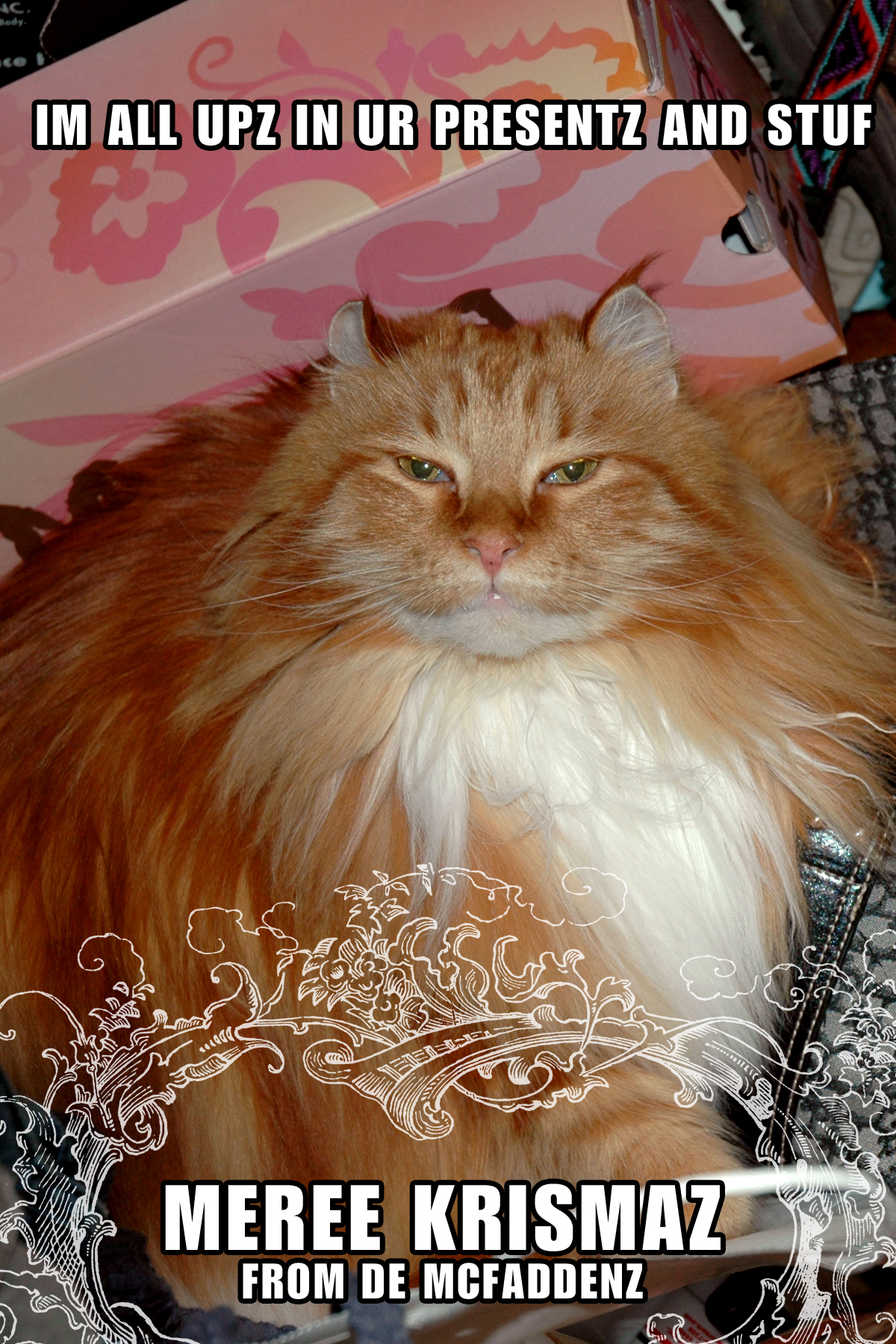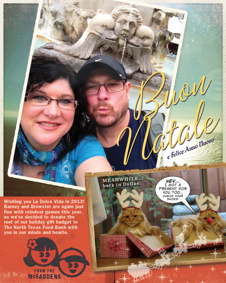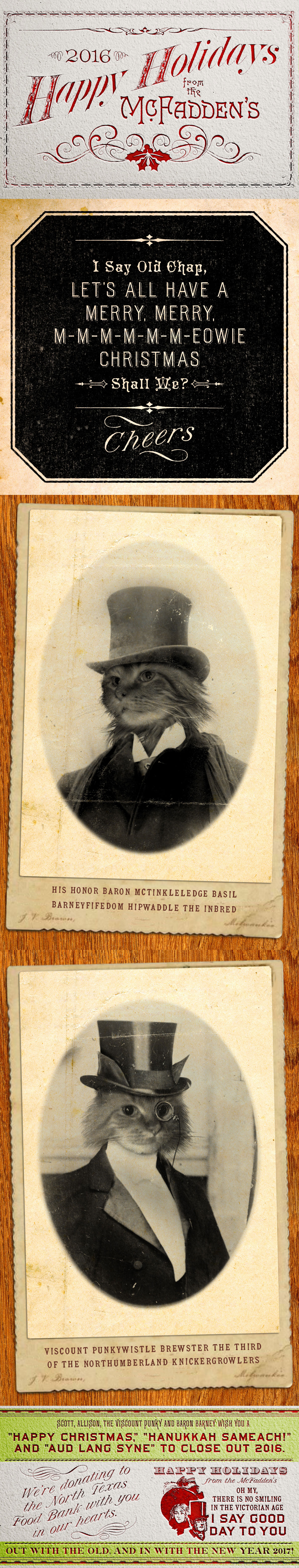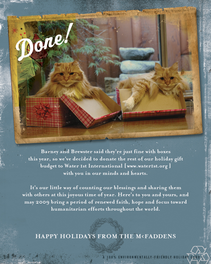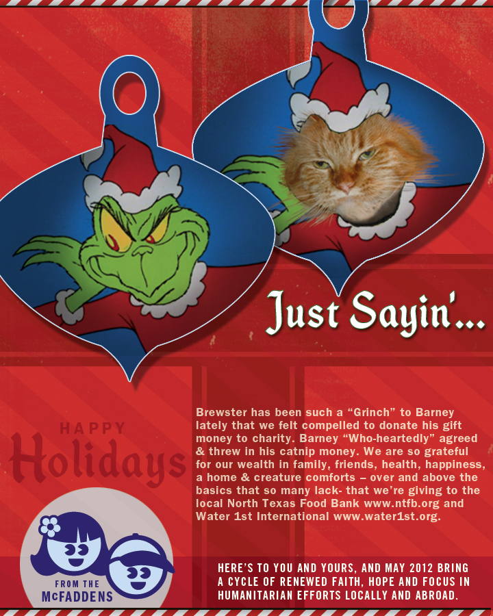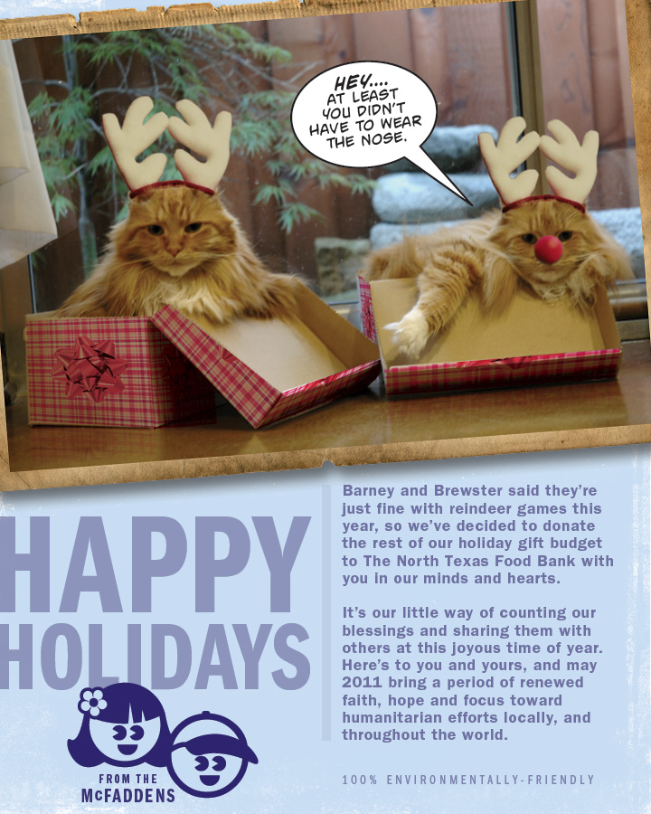 It is that time again…and if you know the McFaddens, then you have been the recipient of our traditional holiday cards for the last 12 years that feature our favorite little furry buddies, better known as Punky (a.k.a. Brewster) and Barney, a slightly rare pair of Main Coon Orange Tabby brothers. Our kitty guys have passed on, so I’m sharing a little tribute to their memory up on the blog today. Check out the retrospective of our cool cats hamming it up for the camera!