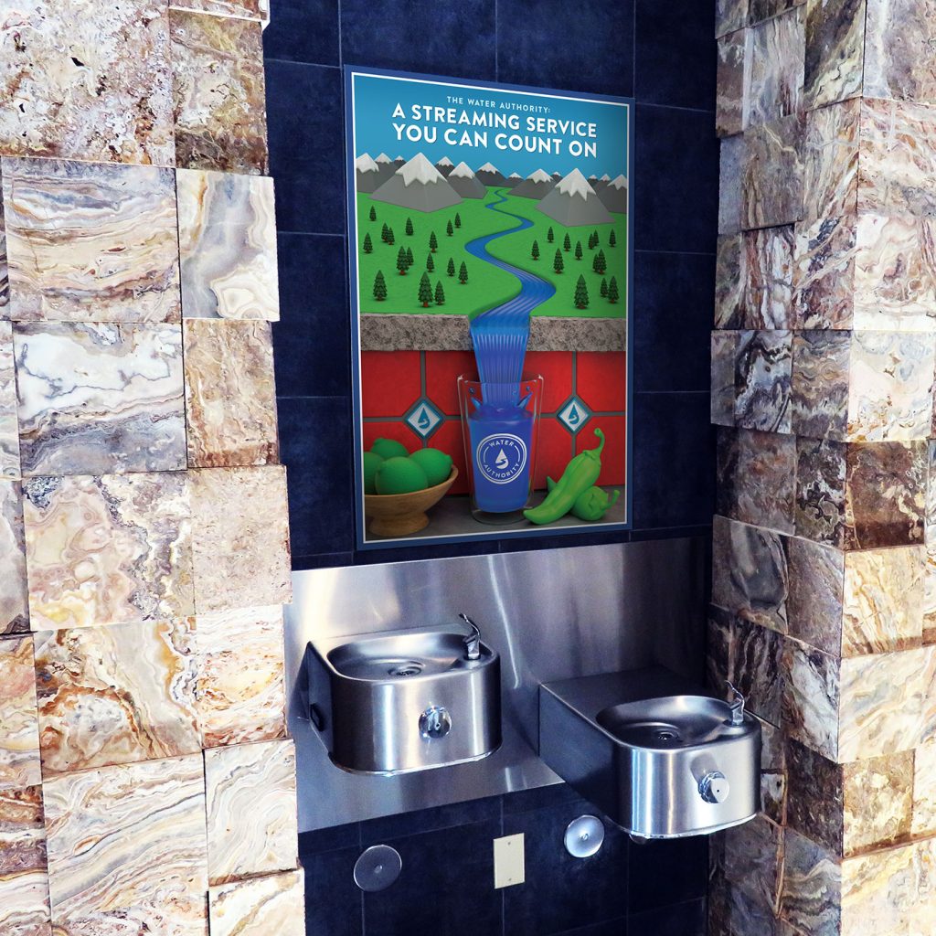 Working with my buddy and client David Morris over at abcwua.org, we set out to update the posters adorning the water fountains at the UNM basketball arena (aka “the Pit”). The concept was simple: delivering water straight from nature to your glass.