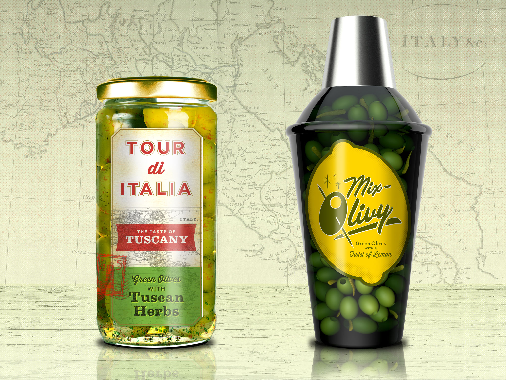 Packaging bottle and label concept ideas developed for an olive oil product line. Concepts were used for focus groups testing new flavor profiles.