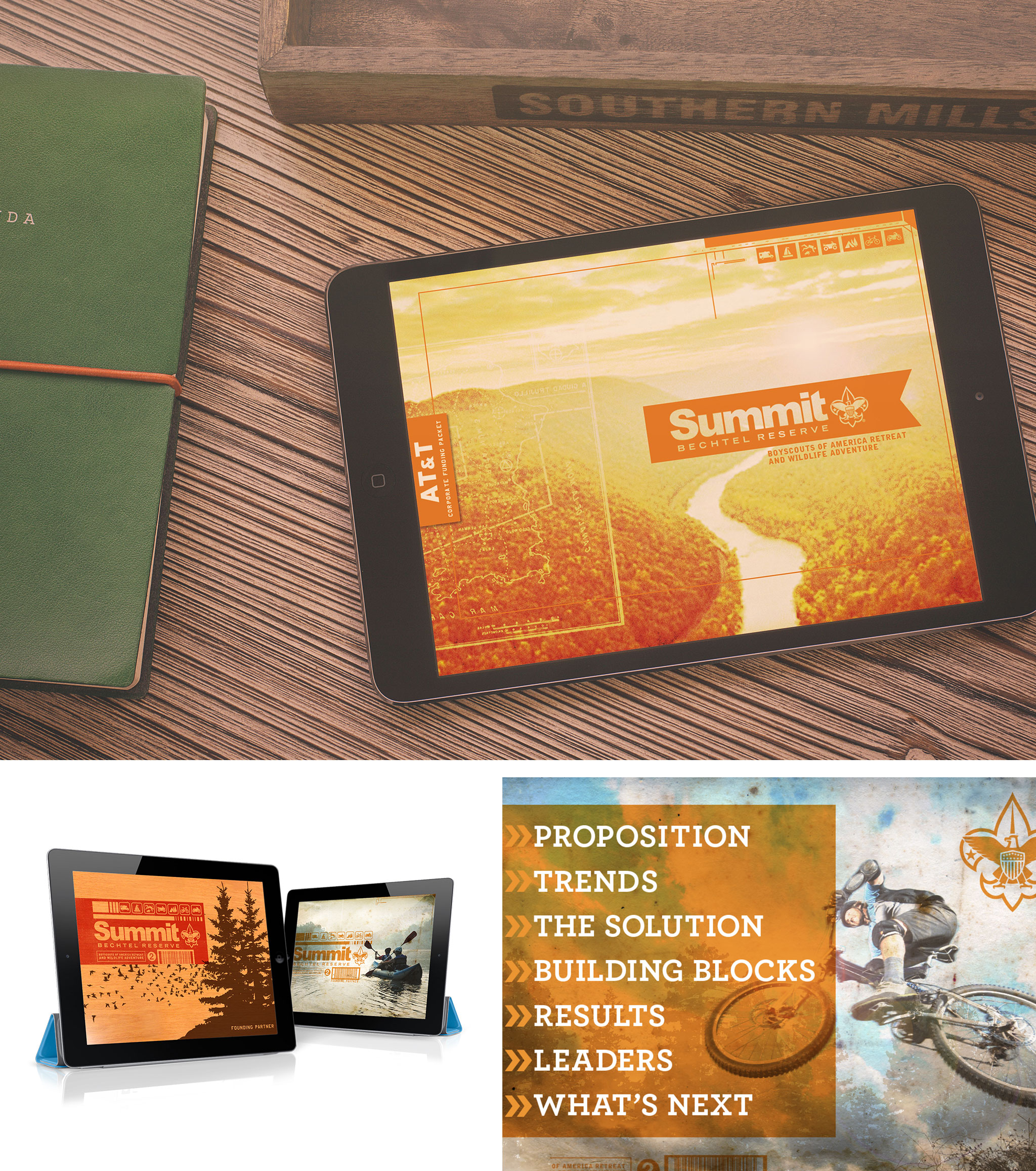 work_digital_boyscoutsBranding and design of the AT&T interactive iPad App sponsoring the Boy Scouts of America. The app was developed and designed to specifically sell corporate sponsorships to the newly opened Summit Bechtel Reserve in West Virginia.
