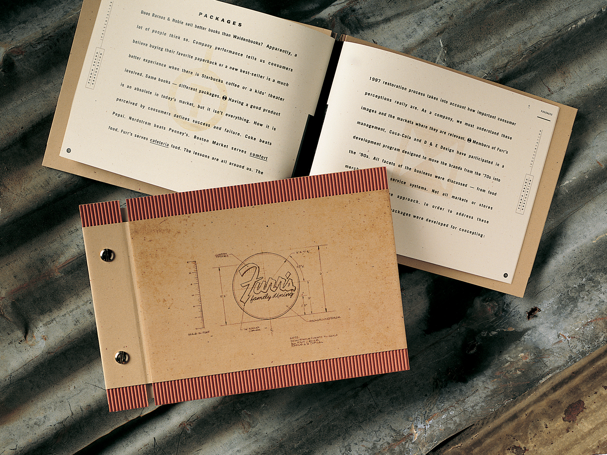 Development of a store reconstruction presentation booklet to the board of directors at Furr’s Cafeteria. Each presentation book was hand-made by a team of book binders.