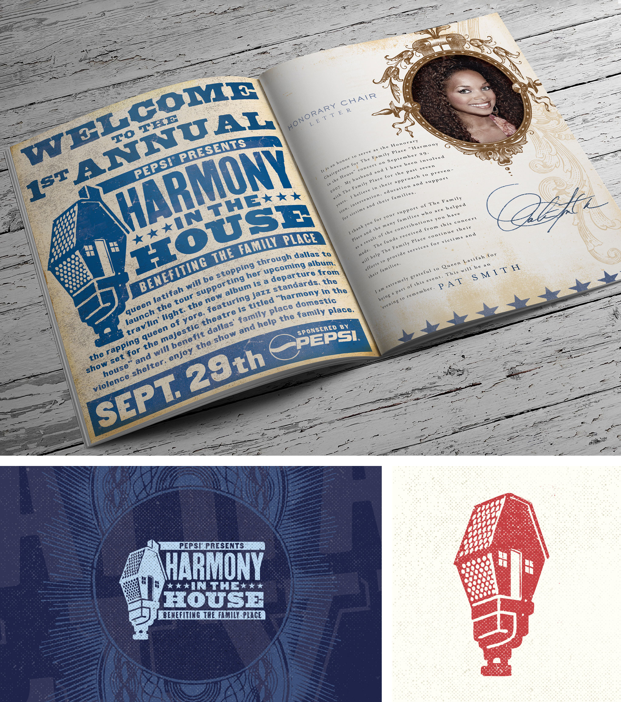 work_design_harmonyBrand development for “The Family Place” Charity Campaign sponsored by Pepsi-Cola. The event included a night of entertainment with Queen Latifah with all benefits going to “The Family Place” charity. Elements included Logo Design, Event Brochure and Promotional Materials.