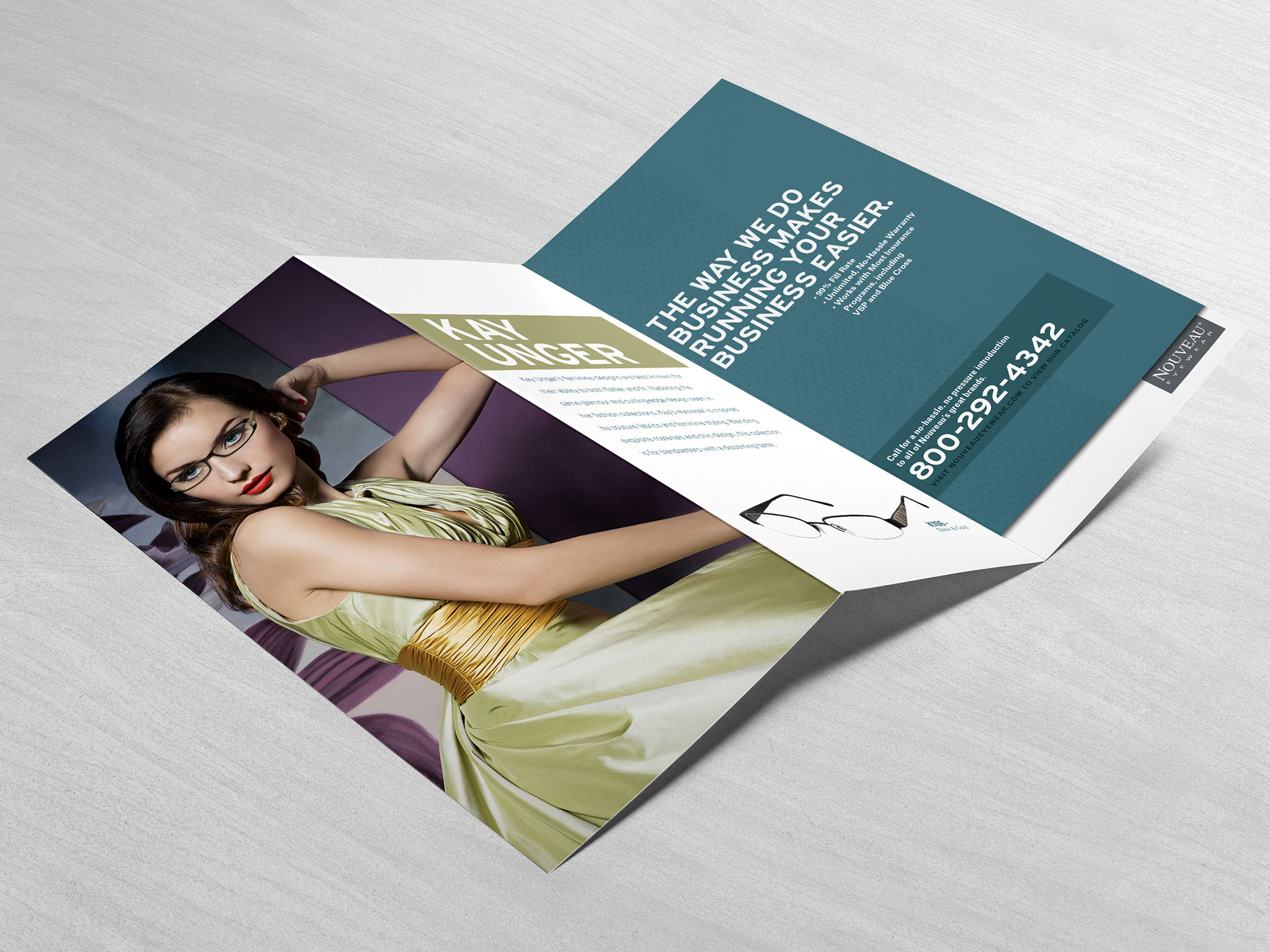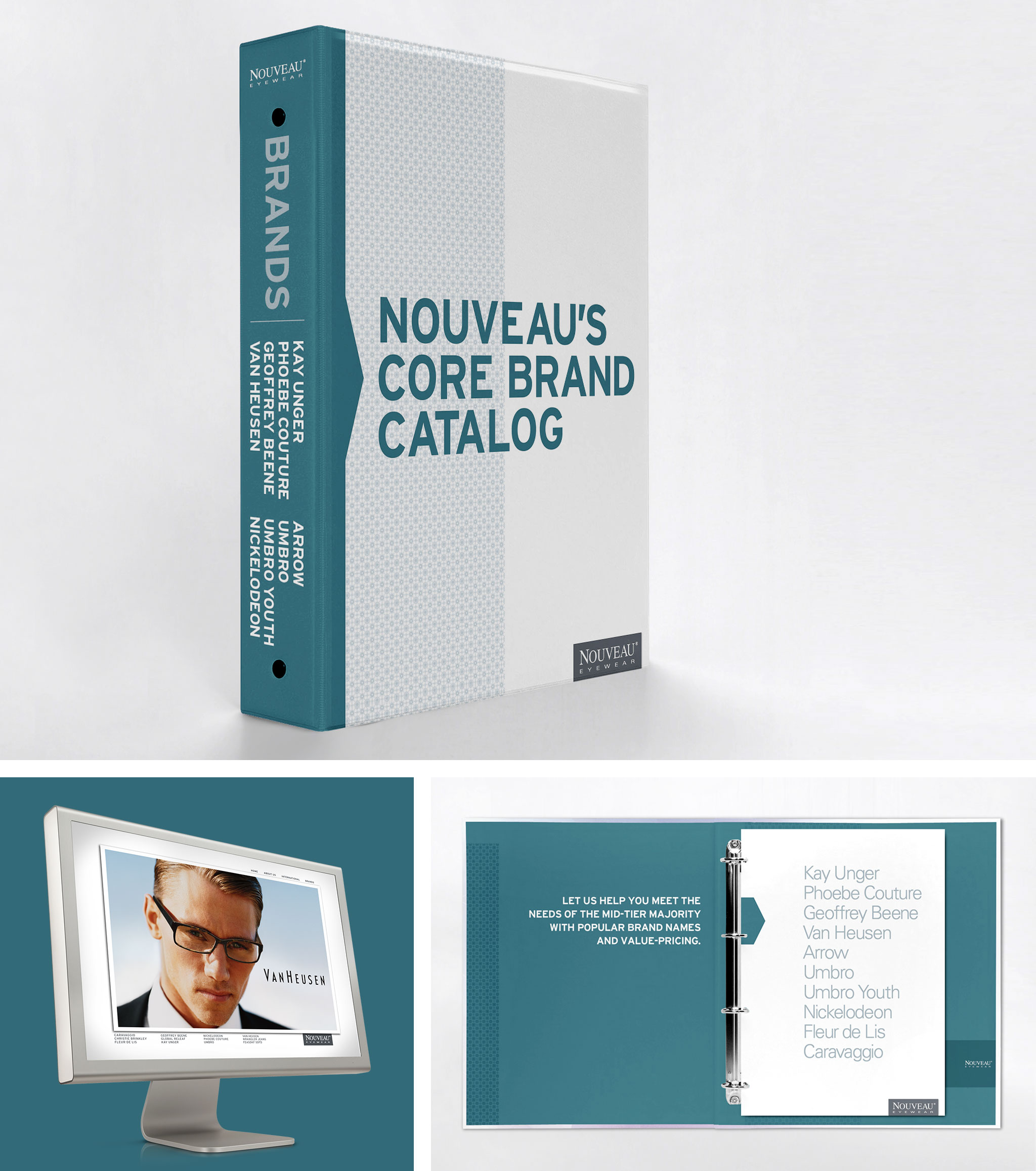 Branding development for Nouveau Eyewear. Nouveau Eyewear specializes in eye frame and case packaging creation for licensed brands. Elements included Inventory Catalogs, Product Brochures, Website Design and Sales Materials.