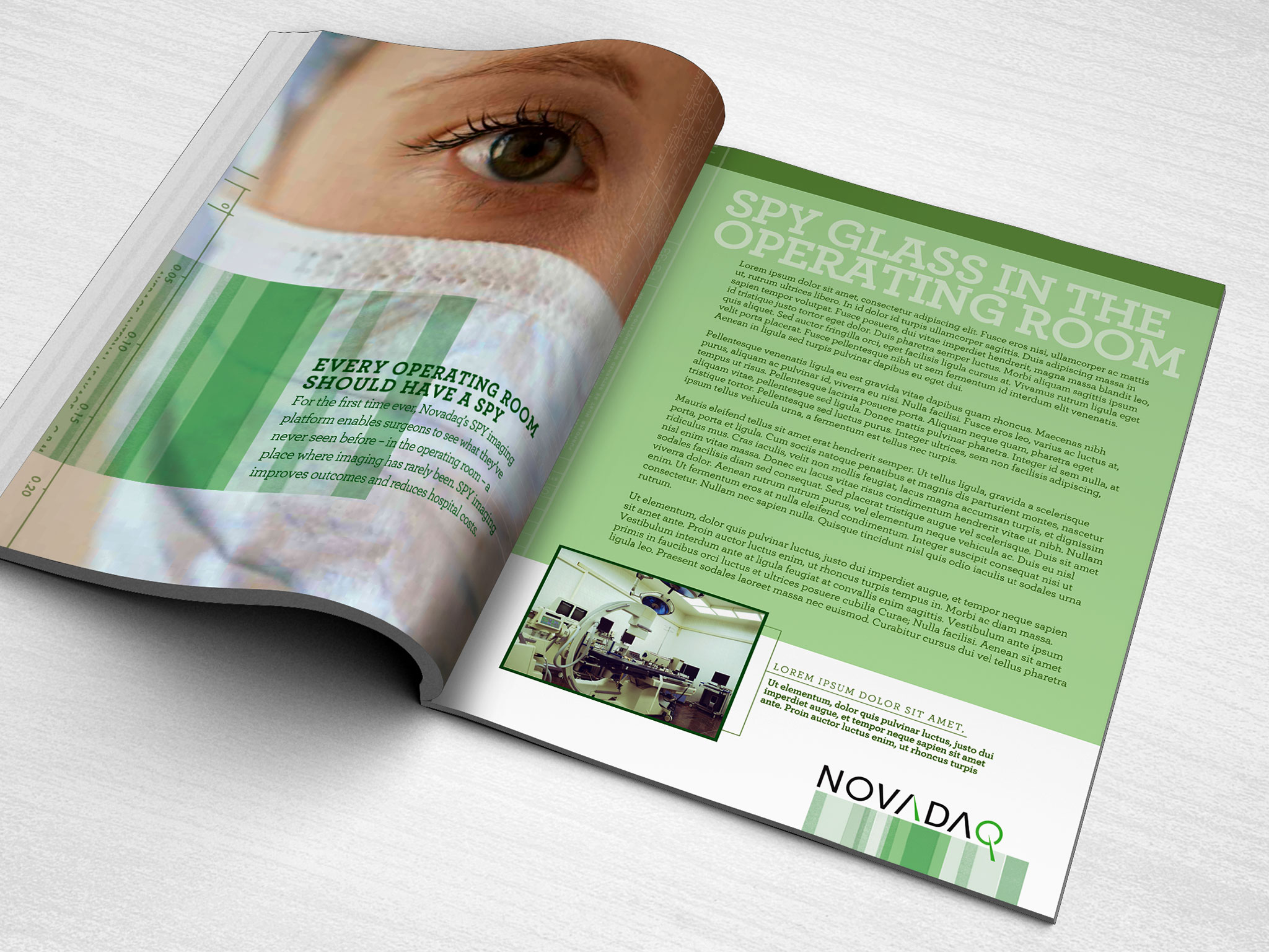 Design concepts for the Novadaq Annual Report. Novadaq develops fluorescence imaging technology which provides surgeons with real-time visualization, leading to improved outcomes,reduced costs and without exposing the patient to harmful ionizing radiation or contrast dye toxicity.