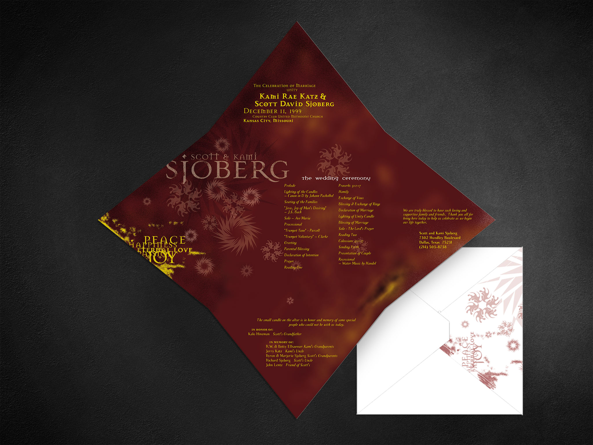 Wedding invitation design for Scott & Kami Sjoberg. The invite is a self-mailer that folds into itself.