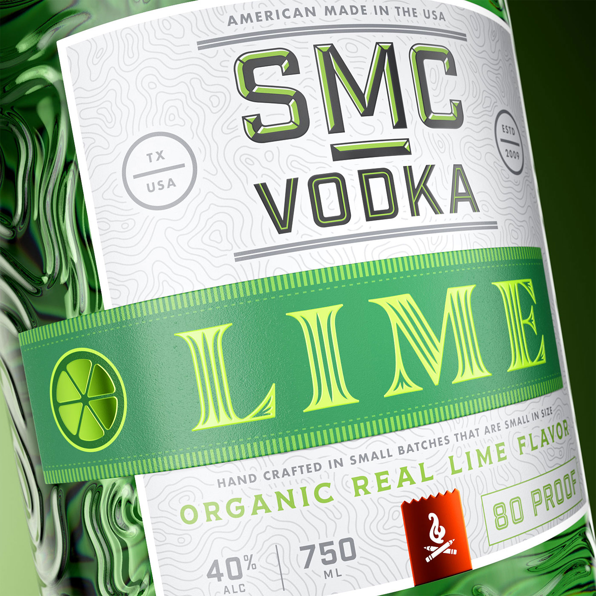 SMC Distillery: Lime Vodka – To upscale the product, I add some paper textures, shiny foils and some embossing on the glass. For the main branding shot, I electrified the lime logo, sliced it up and wrapped it around the bottle. It’s cocktail time folks! :)